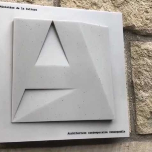 Cast acrylic building plaque recognising contemporary architecture in France