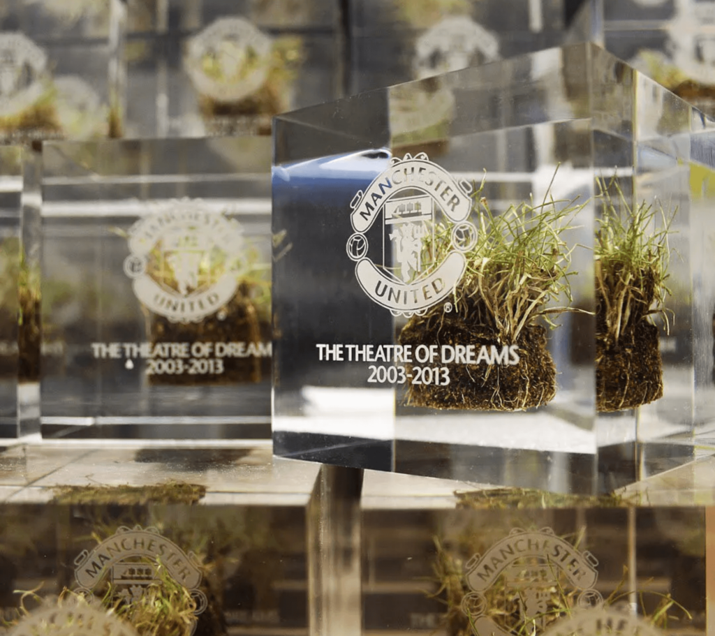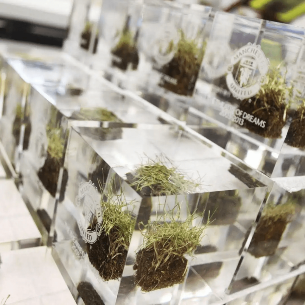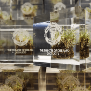 Midton designed and manufactured bespoke clear acrylic turf cubes containing genuine sections of Old Trafford grass. Multiple formats were produced including: